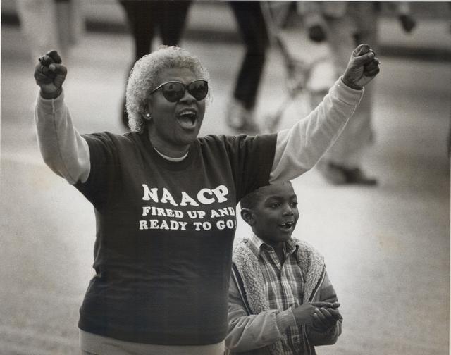The above photo (taken by Charles Slate for the Myrtle Beach Sun News) captures a scene from a 1989 NAACP “March Against Intimidation” through the streets of Conway. “Fired up! Ready to go!” was the signature slogan of the protests, which grew to become known as the Conway Movement. Barack Obama says that he borrowed “Fired up! Ready to go!” from a Greenwood, SC, woman named Edith S. Childs. Rev. Dr. Nelson Rivers of the national NAACP says that Edith S. Childs borrowed it from the Conway Movement.